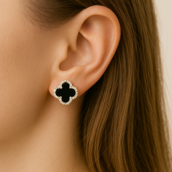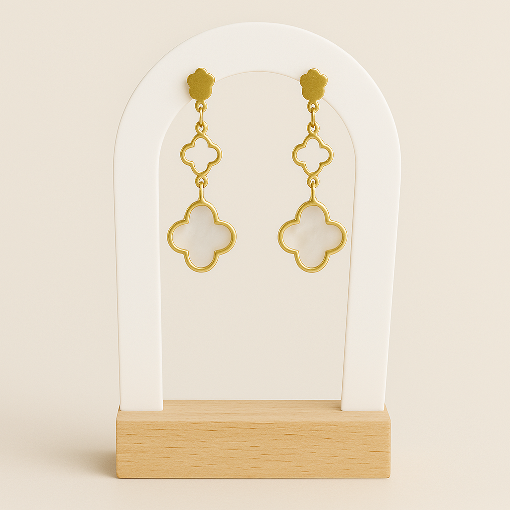 Voeg een vleugje elegantie toe aan je look met deze verfijnde oorbellen in zachte beige tinten. Het ontwerp bestaat uit twee sierlijke klavers: één opengewerkt voor een luchtige, moderne uitstraling, en één prachtig gevuld met glanzend parelmoer. De combinatie van de organische glans van parelmoer en het speelse, maar chique klaverdesign maakt deze oorbellen tot een tijdloos accessoire dat moeiteloos elke outfit verrijkt.